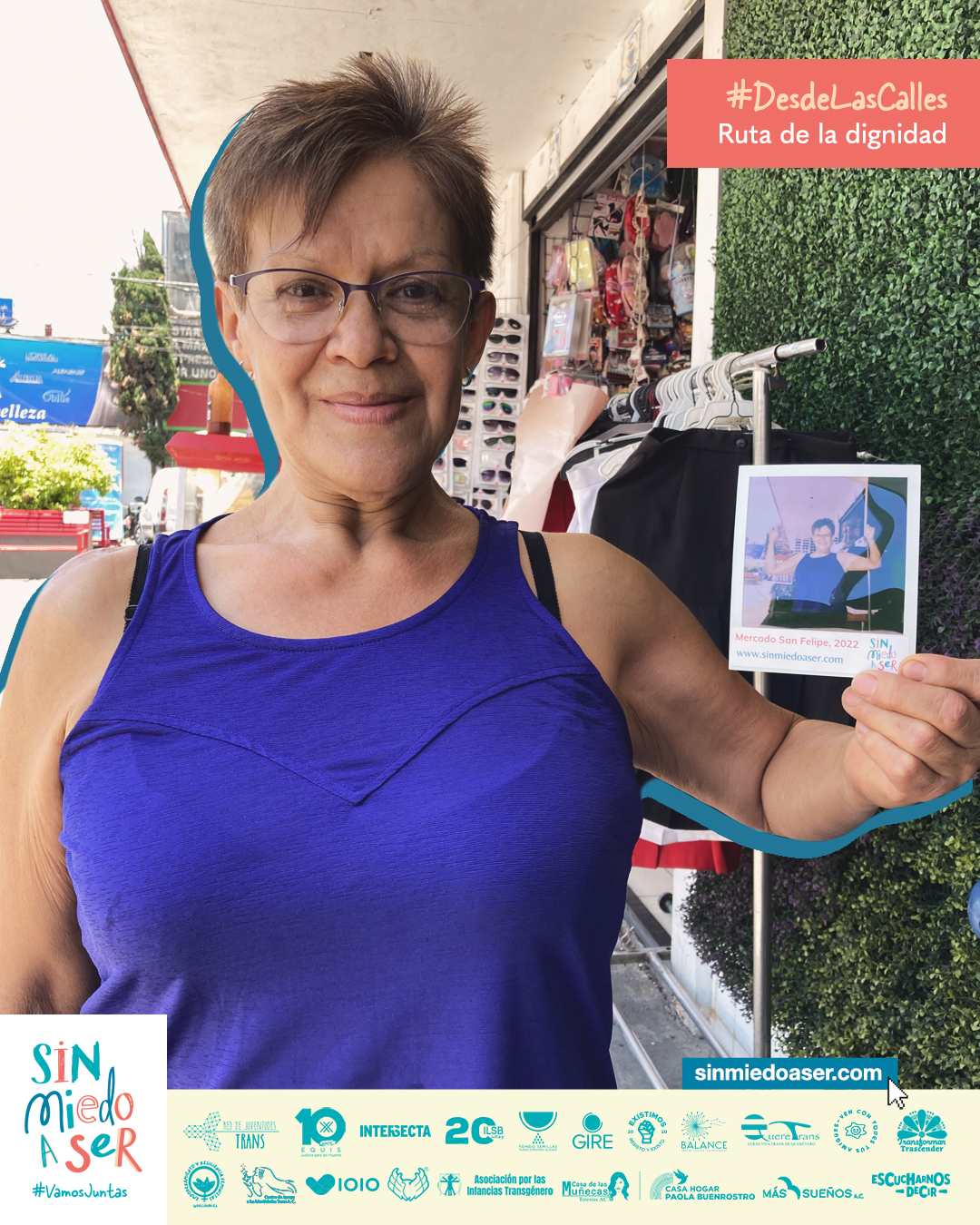 "Tengo 65 años. En mis tiempos fue muy difícil salir adelante. En la mañana era mamá, en la tarde estudiaba, en la noche trabajaba. Fui muy lastimada pero hoy estoy victoriosa porque logré ser yo misma. Un México sin miedo a ser sería precioso, porque todo mundo podríamos ser como somos."
